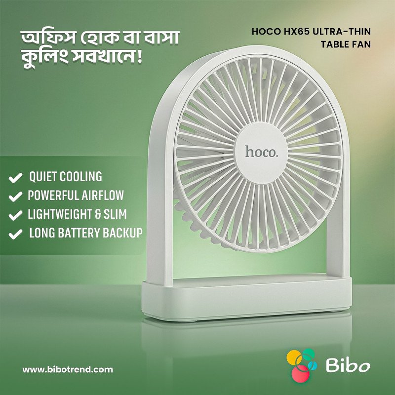 Upgrade your daily comfort with the HOCO HX65 Ultra Thin Rechargeable Table Fan, a perfect combination of style, performance, and portability.