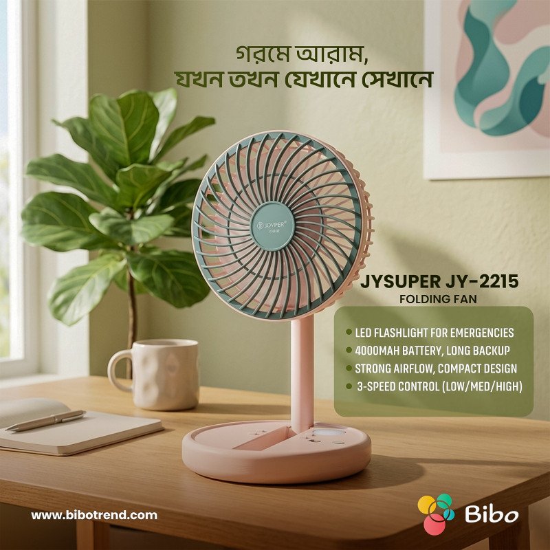 Stay cool and prepared during load shedding with the JYSUPER JY-2215 Rechargeable Foldable Fan. Featuring a powerful 4000mAh battery, 3-speed airflow, and built-in LED flashlight, this compact fan is perfect for home, travel, and emergency use.